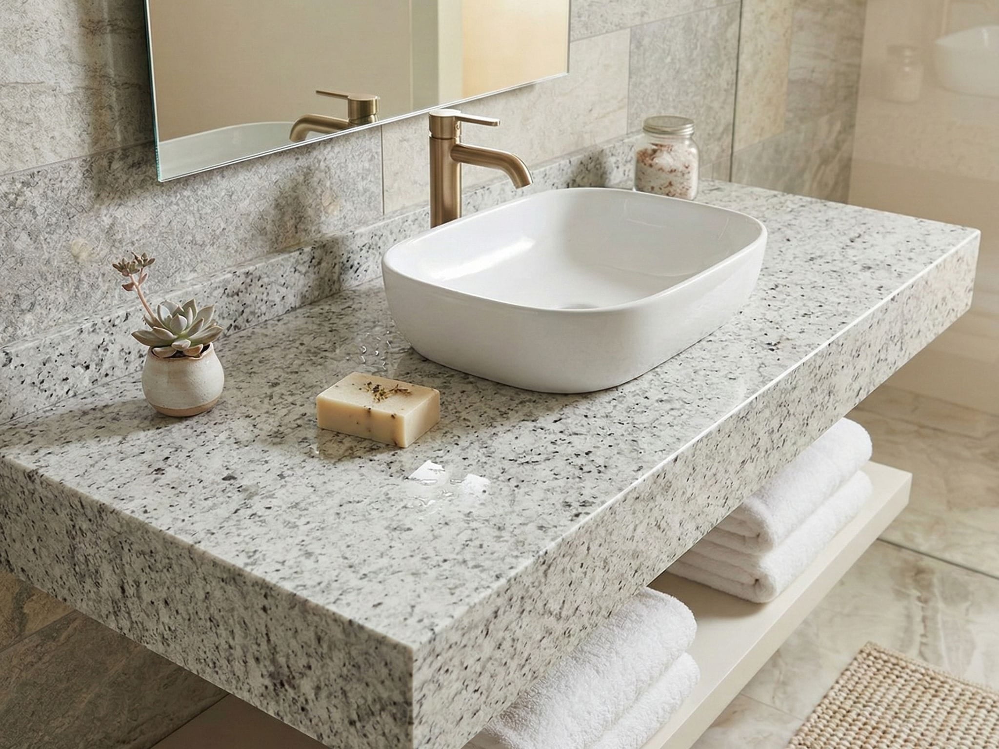 Despite its luxurious appearance, this granite countertop is easy to maintain. Regular cleaning with mild soap and water keeps the surface looking polished and fresh. Periodic sealing helps protect against stains and moisture, preserving the stone’s natural beauty for years. Its durability and low maintenance requirements make it a practical and cost-effective investment for any home.