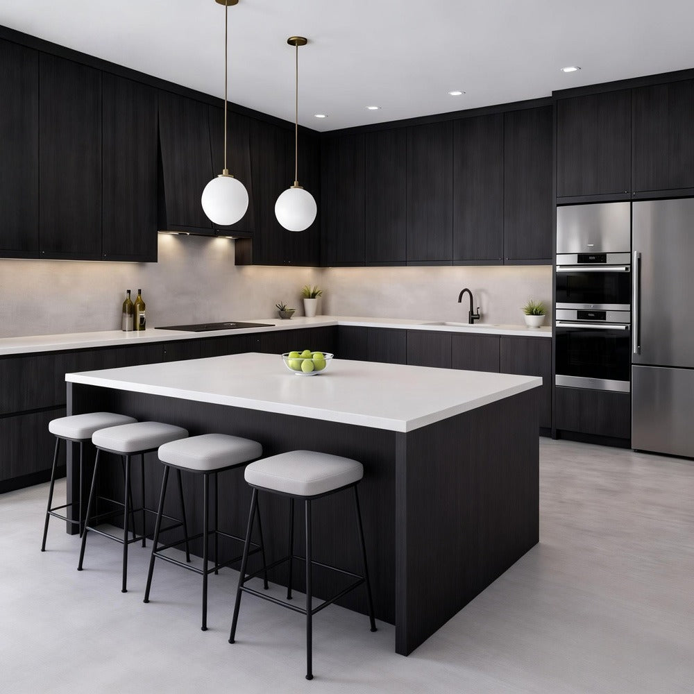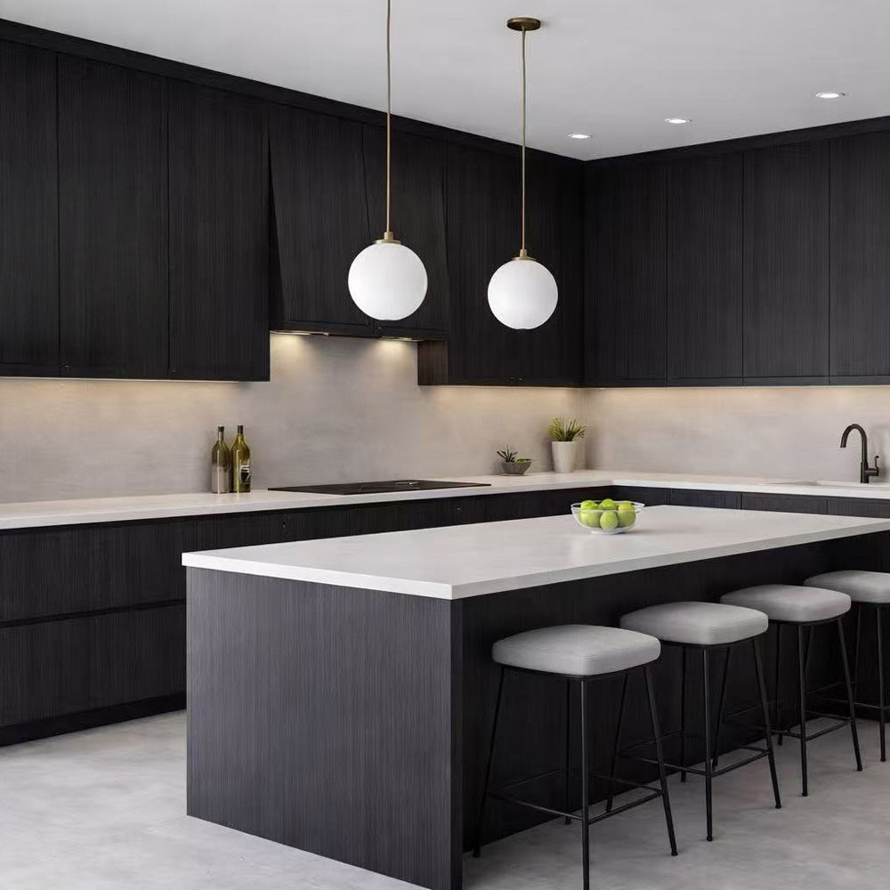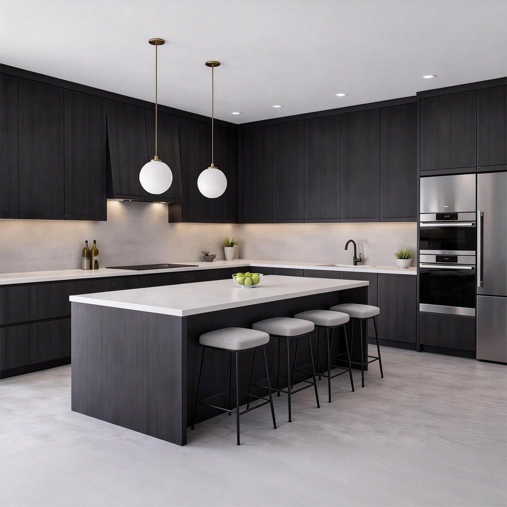 This rich dark wood cabinet finish delivers a bold, sophisticated look with a refined vertical grain that adds depth and modern character. The deep tone brings warmth and drama to the space while maintaining a clean, contemporary aesthetic that feels both luxurious and timeless.