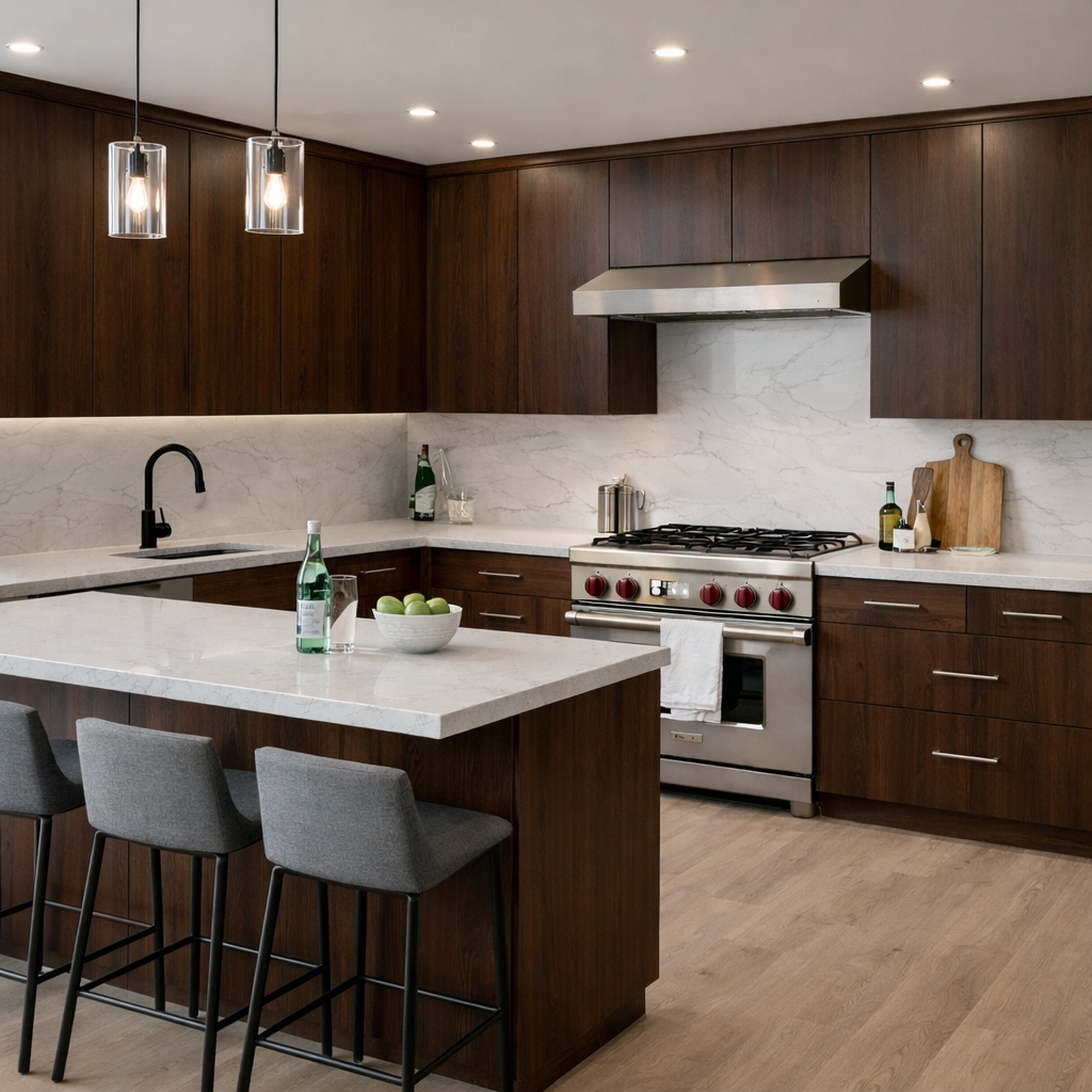 Designed for designers, builders, contractors, and homeowners seeking elevated kitchen design, Walnut Frameless cabinets combine modern structure with timeless wood appeal.