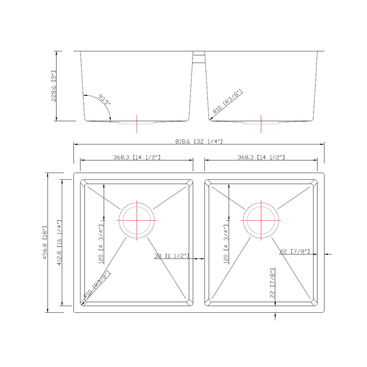 Drain size: 3-5/8", STANDARD USA SIZE