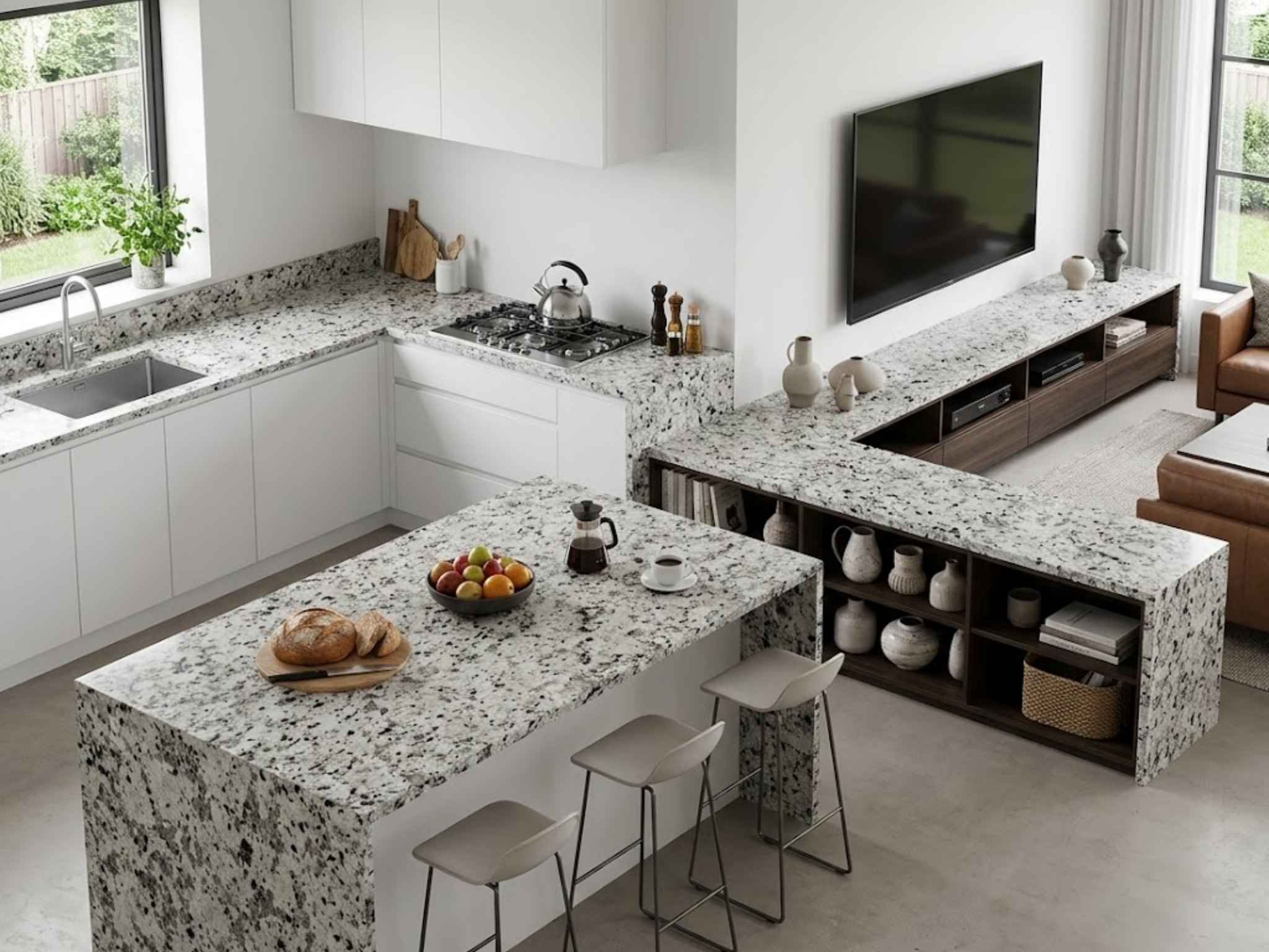 The White Flower Granite Countertop is suitable for a variety of applications, including kitchen countertops, islands, bathroom vanities, bar tops, and backsplashes. Its bright neutral tones pair beautifully with white, cream, gray, or wood cabinetry and complement stainless steel appliances, chrome or matte black fixtures, and a variety of backsplash styles. Whether used as a statement piece or a subtle complement, it enhances the overall elegance of any space.